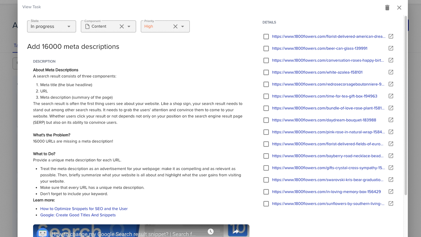 As mentioned above, tasks are a mix of standard basic SEO measures and issues found in weekly automated audits of your website.